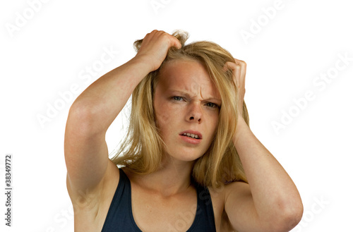 © Martina Osmy, Fototapeta premium Young woman tearing her hair on white background