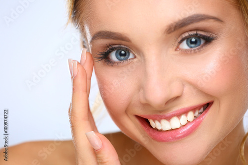 © shefkate, Obraz premium Young woman touching her face isolated on white background
