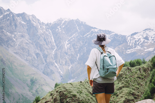Obraz premium Young woman tourist admiring mountains in in Georgia