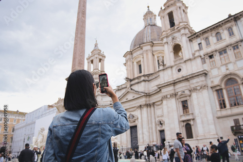 Fototapeta premium Young woman tourist is taking a photo of sant'agnese in agone and the obelisk using her smartphone in the famous piazza navona in rome, italy