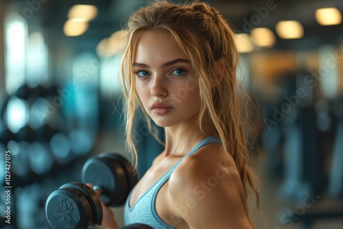 © Oleksandr, Obraz premium Young woman trains with dumbbells in modern gym during daytime workout session