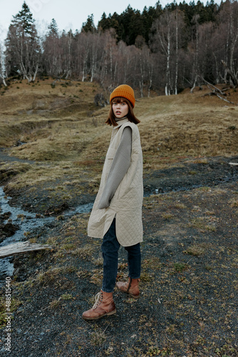 Naklejka premium young woman trees without leaves travel fresh air landscape