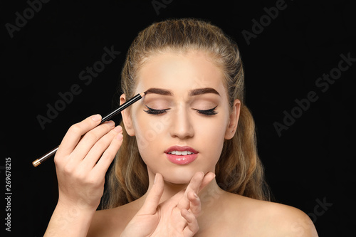© Africa Studio, Fototapeta premium Young woman undergoing eyebrow correction procedure on dark background
