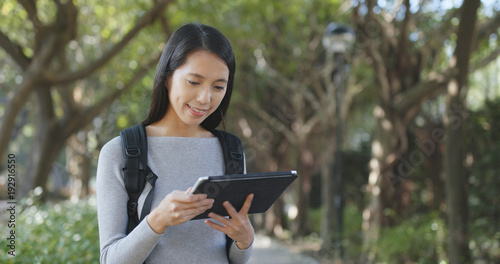 © leungchopan, Fototapeta premium Young Woman use of tablet computer at outdoor