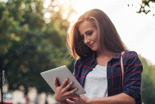 © mavoimages, Obraz premium Young woman using a tablet while out in the city