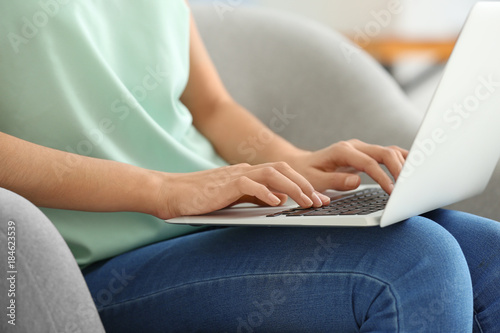 © Africa Studio, Naklejka premium Young woman using laptop at home, closeup