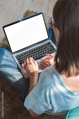Naklejka premium Young woman using laptop blank screen to work, sitting on the floor at home....