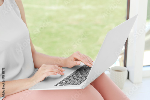 © Africa Studio, Naklejka premium Young woman using laptop for searching information in internet on window sill