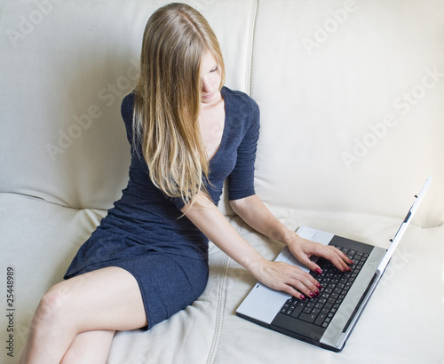 © slavson, Naklejka premium Young woman using laptop on the couch