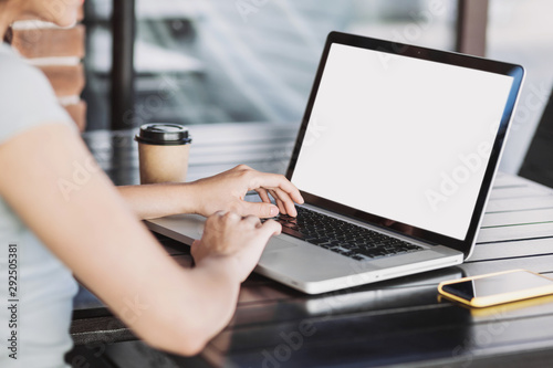 © kite_rin, Naklejka premium Young woman using laptop outdoor. Student girl working at cafe. Blank white empty device screen monitor. Work or study, freelance concept