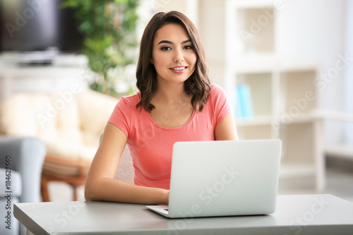 © Africa Studio, Naklejka premium Young woman using laptop while sitting at table
