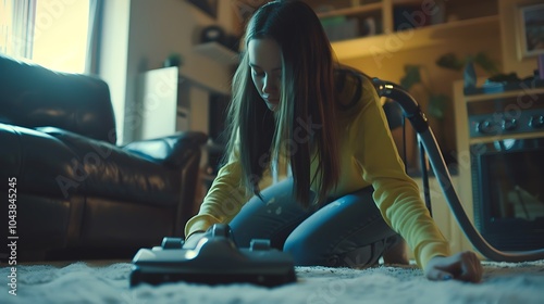 Obraz premium Young woman vacuuming floor