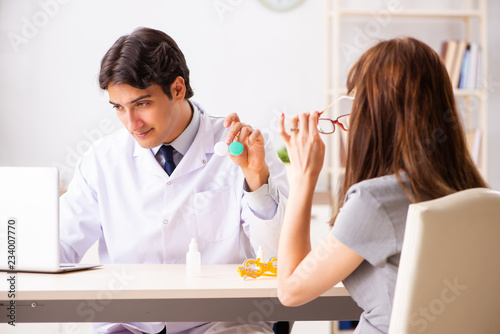 Fototapeta premium Young woman visiting male doctor ophthalmologist in hospital