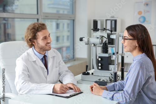 © Pixel-Shot, Obraz premium Young woman visiting ophthalmologist in clinic