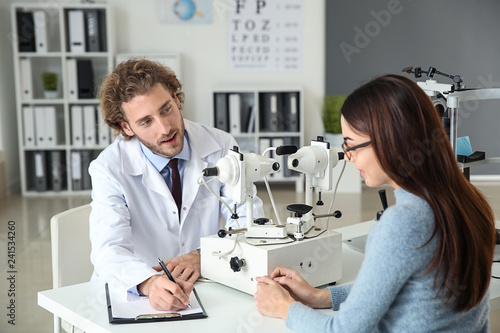 © Pixel-Shot, Obraz premium Young woman visiting ophthalmologist in clinic