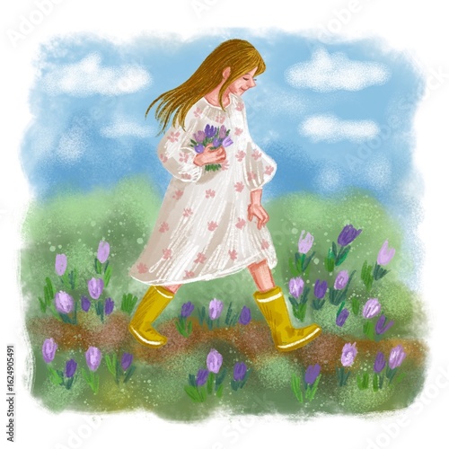 © lika2266, Fototapeta premium young woman walking in spring with tulips