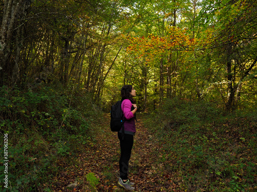 © Egoitzainhoa, Fototapeta premium young woman walking in the forest with a backpack
