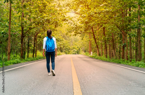 © UKRIT YASUWAN, Fototapeta premium young woman walking on the road in a forest
