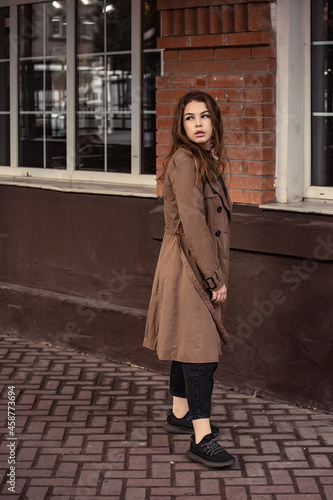 © Anastasia.photoyoga, Fototapeta premium Young woman walking on the street city wall background in brown coal and black shoes. Autumn season