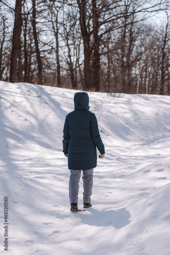 Obraz premium Young woman walks in forest. Caucasian woman stand on road among trees in snowy forest and enjoy sun, rear view.