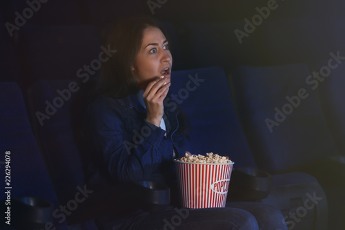 Fototapeta premium Young woman watching movie and eating popcorn in cinema