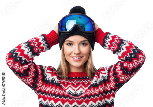 Fototapeta premium Young woman wearing a red and white patterned sweater and ski goggles, smiling and holding goggles on her head, isolated on transparent background