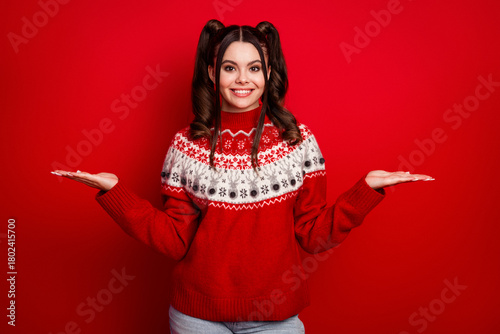 © deagreez, Fototapeta premium Young woman wearing a red Christmas sweater smiles against a solid red background with open hands for festive stock photo