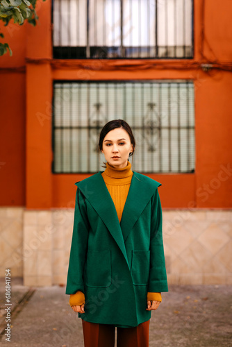 © tunedin, Fototapeta premium Young woman wearing green jacket standing against building in city