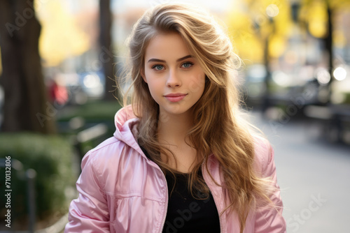 © vefimov, Fototapeta premium Young woman wearing pink jacket standing on sidewalk. Suitable for lifestyle, fashion, and urban themes.