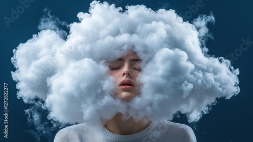 © Rattapoom, Fototapeta premium Young woman with a cloud over her head surrounded by misty atmosphere and dreamy environment