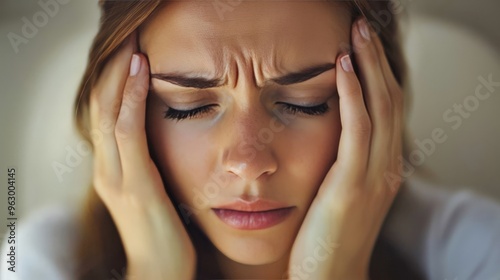 Fototapeta premium Young woman with a headache, common health problems, soft background, focus...