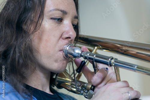 © biggur, Obraz premium Young woman with a saxophone. Burning brunette. Musician with an instrument.