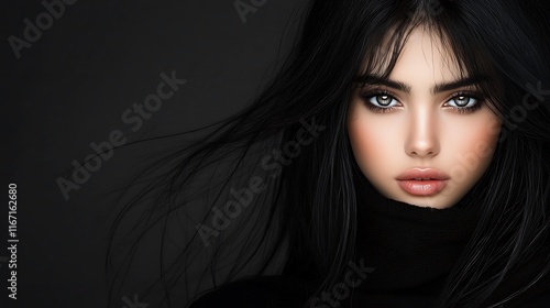 Fototapeta premium Young woman with a timeless look, black disheveled hair framing her delicate...