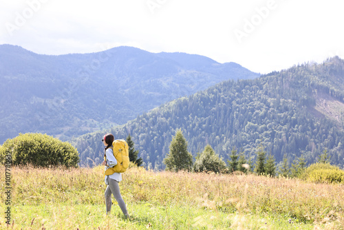 Fototapeta premium Young woman with backpack hiking in mountains