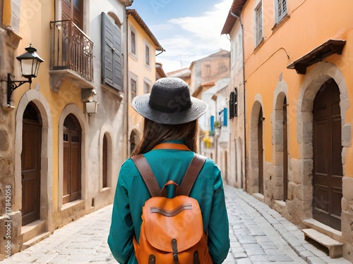 © mansum008, Fototapeta premium young woman with backpack in the city