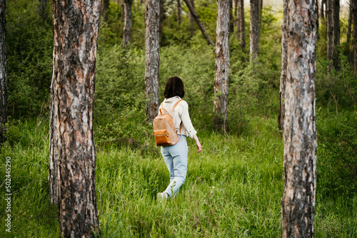 Naklejka premium Young woman with backpack walking alone in a forrest
