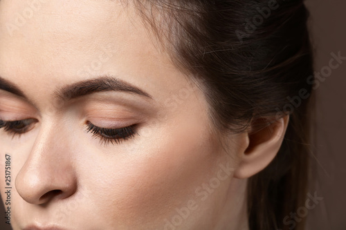 Obraz premium Young woman with beautiful eyebrows on color background, closeup