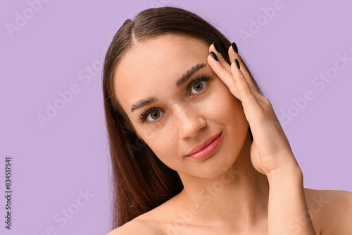 Fototapeta premium Young woman with beautiful eyebrows on lilac background