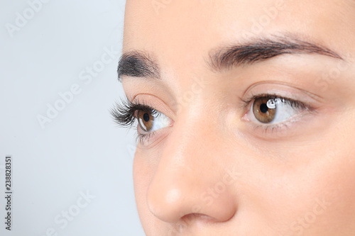 © New Africa, Fototapeta premium Young woman with beautiful eyelashes on gray background, closeup view