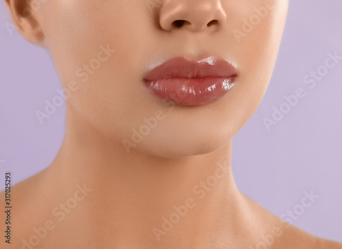 Obraz premium Young woman with beautiful full lips on lilac background, closeup