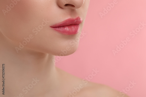 Obraz premium Young woman with beautiful full lips on pink background, closeup