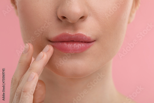 Obraz premium Young woman with beautiful full lips on pink background, closeup