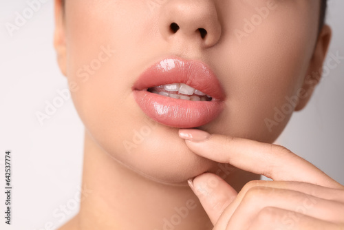 Obraz premium Young woman with beautiful lips on light background, closeup