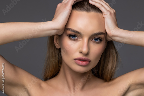 © F8 \ Suport Ukraine, Naklejka premium Young woman with beauty skin and beauty hairstyle isolated over gray background