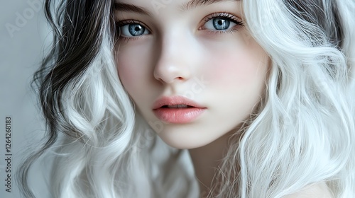 © Asma24, Obraz premium Young Woman with Bleached Hair and Expressive Blue Eyes on Light Background