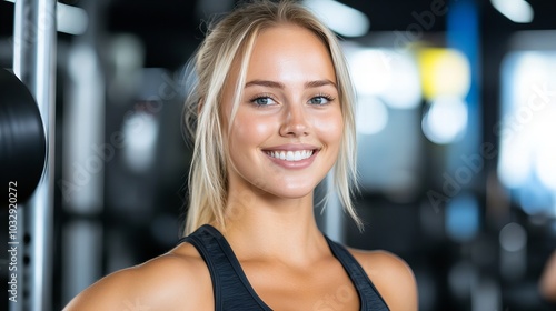 Fototapeta premium Young woman with blonde hair smiles at the camera at the gym.