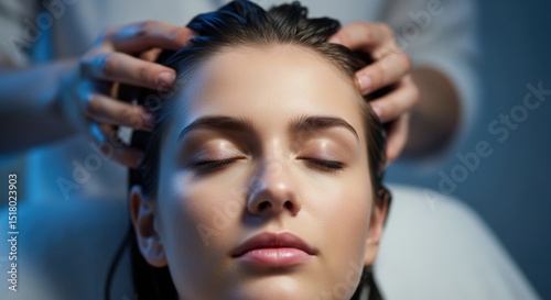 Fototapeta premium Young woman with closed eyes receiving a relaxing head massage in a spa setting