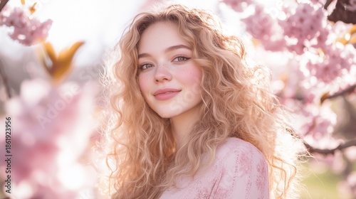 © Chen, Fototapeta premium Young woman with curly blonde hair stands amidst blooming sakura trees, embodying serenity and natural beauty.