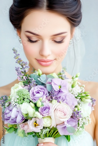© Luiri Art, Naklejka premium Young woman with dark hair in an elegant updo holding a pastel bouquet of lavender and white flowers, eyes closed and smiling softly