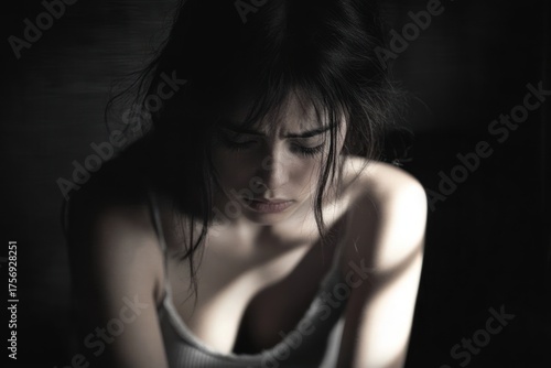 © oppo, Naklejka premium Young woman with dark hair looking down with a somber expression in soft light and shadow